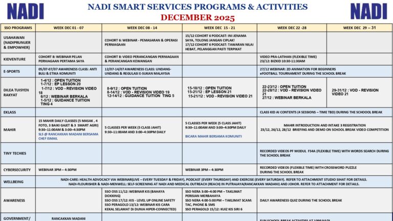 TAKWIM AKTIVITI DISEMBER 2025 Untuk sebarang pertanyaan atau pendaftaran kelas komputer/kursus, boleh hubungi petugas NADI Kg. Alur Limbat :- Rosnani-0199989493 Farah-0189060052 #JadualAktivitiNADI#pusatsebaranmaklumatnasional#nadi#KursusNADI#DISEMBER2025#ProgramPercuma