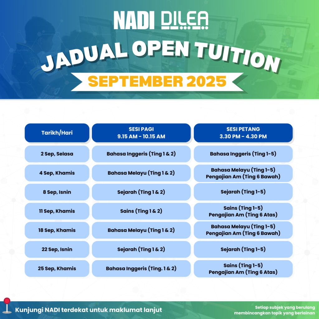 Jadual Open Tuition Untuk Bulan September 2025 sebagai jadual perancangan untuk adik-adik rujuk dan hadir ke mana-mana NADI berhampiran menyertai kelas tuisyen yang disediakan ini.