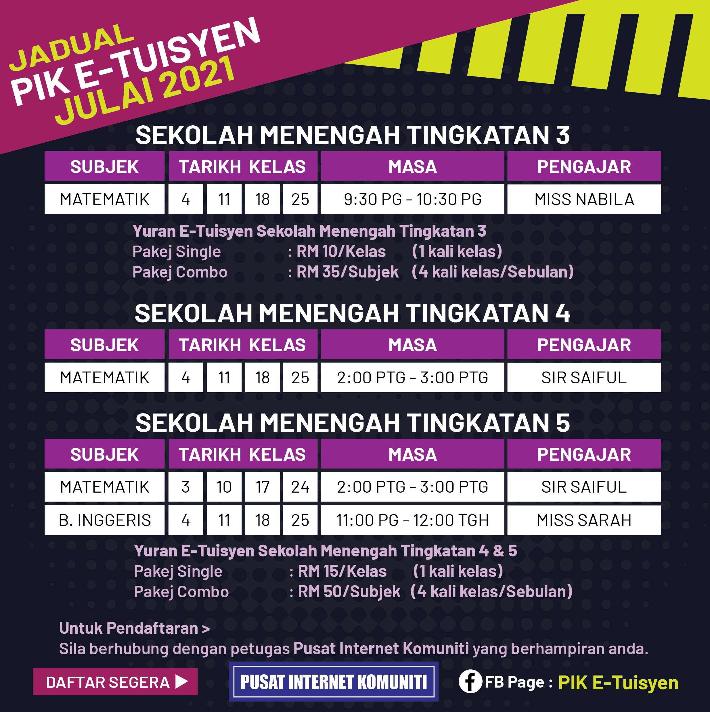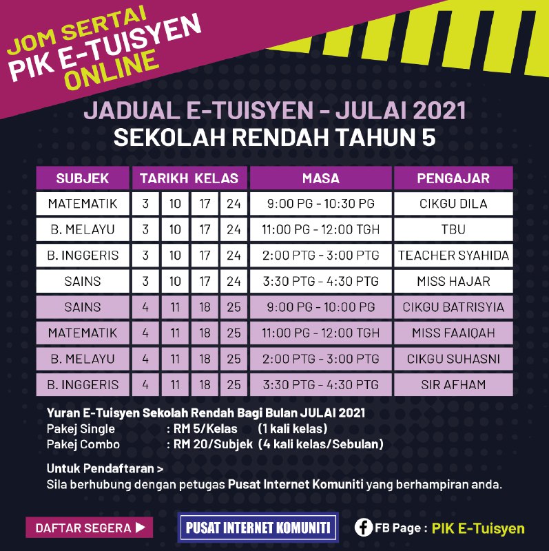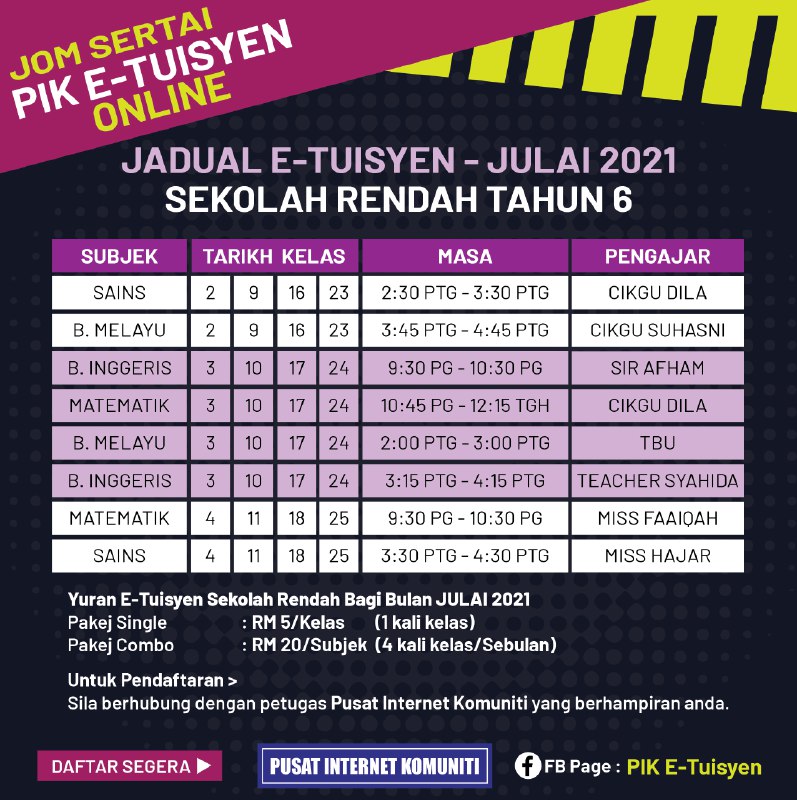 Pendaftaran KELAS RURAL E-TUISYEN secara atas talian telah dibuka untuk bulan Julai 2021. Senarai jadual kelas telah dilampirkan seperti berikut, untuk sebarang pendaftaran dan pertanyaan boleh berhubung dengan petugas PIK:
