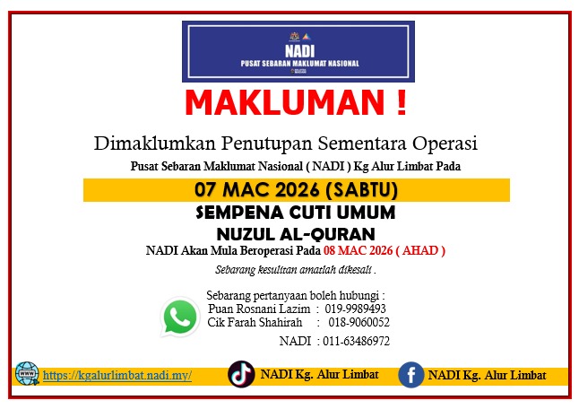 Untuk makluman NADI Kampung Alur Limbat tidak akan beroperasi pada tarikh berikut sempena: