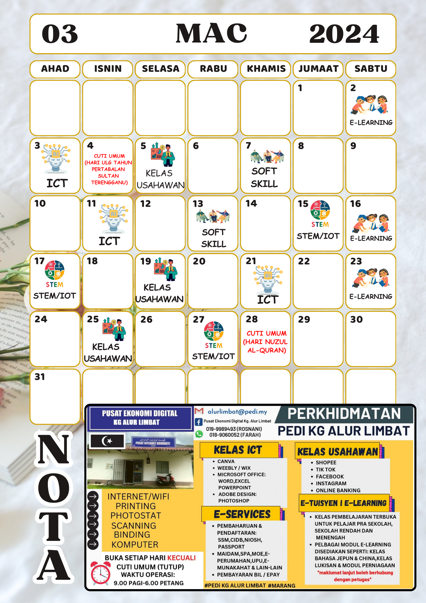 Tarikh :JANUARI 2024 Masa :03.00 PETANG- 04.00 PETANG Tempat : PEDI KG ALUR LIMBAT Peserta : SEKOLAH RENDAH